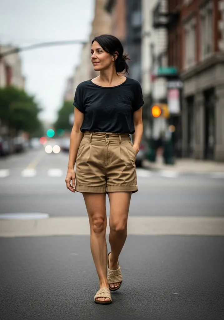 This look blends a slightly relaxed black tee with structured khaki shorts for a simple everyday outfit. The shorts have a tailored feel with neat pleats that add shape. Woven sandals bring softness and texture that keeps the outfit relaxed and wearable.
