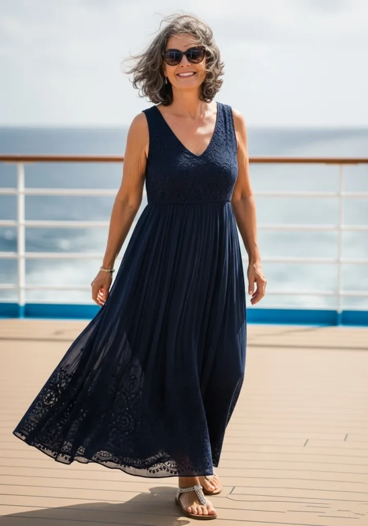 I adore dresses like this for sea days because they feel special without any fuss. The lace gives the dress that gentle touch of romance, and the navy shade works at any time of day. It is the kind of piece that makes me feel graceful even when I am just wandering the deck.