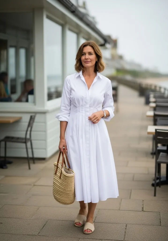 This outfit brings together a classic white shirt dress with a clean tailored look and a soft flow through the skirt. The rolled sleeves keep it relaxed while the pleated details add quiet structure. A woven tote with leather handles and simple beige slides finish the look in the most effortless way.