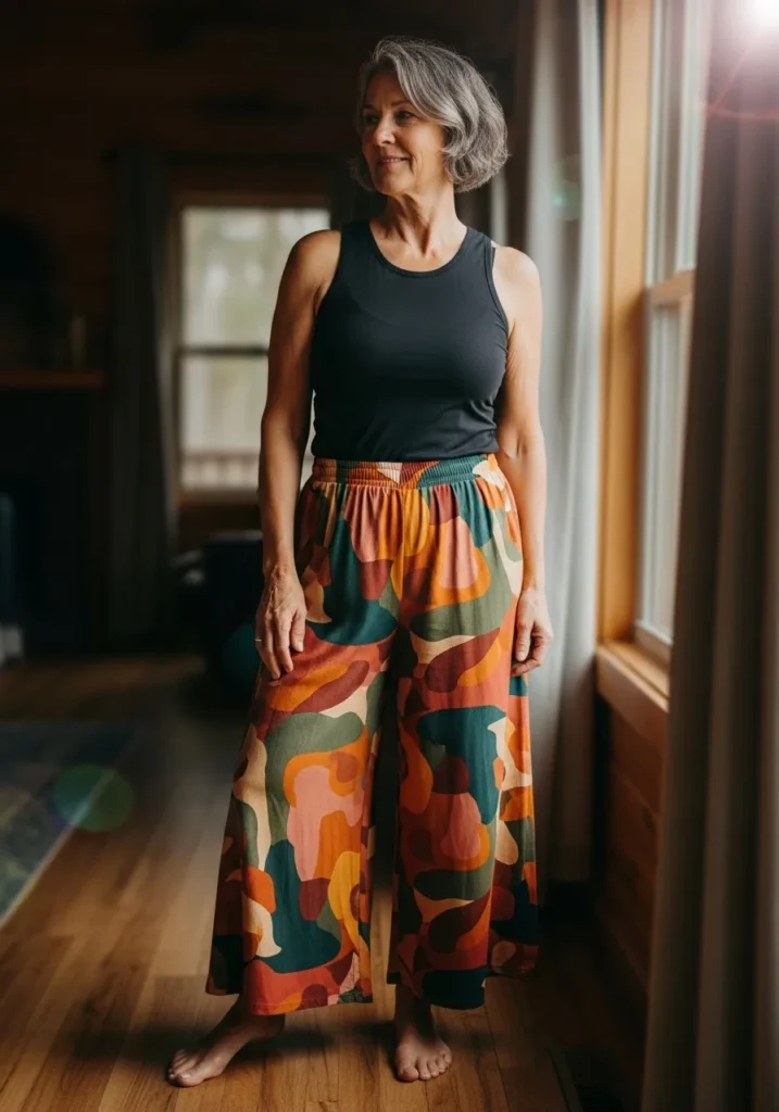 This look pairs a fitted black tank with wide leg pants in a bold abstract print full of rich warm colors. The fabric drapes softly and brings plenty of personality. The elastic waist keeps it comfortable while the flowy legs add a breezy feel that is perfect for lounging or exploring.