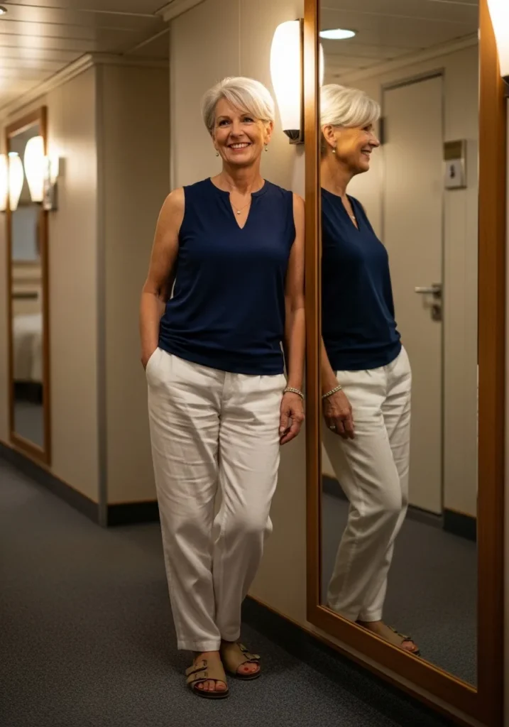 I love this kind of outfit because it always looks crisp and fresh. Navy and white never fail me on a cruise. The whole look feels polished without being stuffy and works for dinner, wandering the halls, or enjoying an evening show.