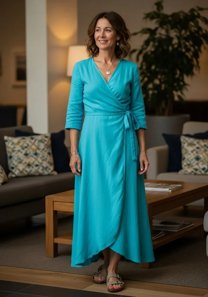 This wrap dress brings a splash of turquoise in the prettiest breezy fabric. The tie waist adds shape while the three quarter sleeves make it versatile for warm or slightly cooler moments. Neutral sandals keep the outfit feeling calm and balanced.