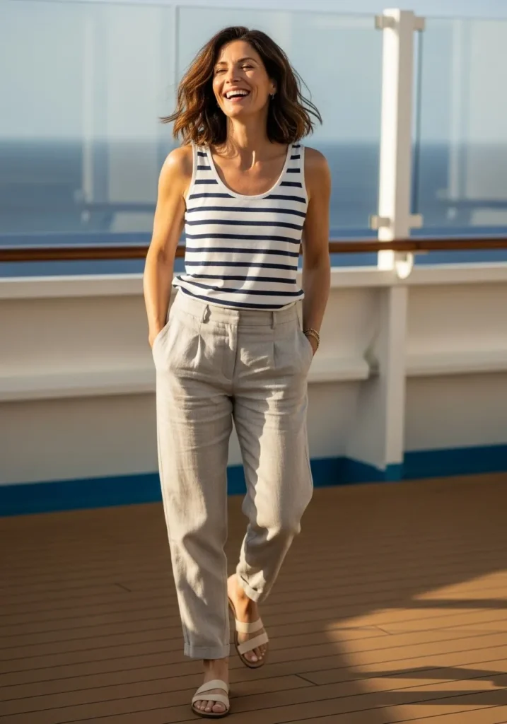 I reach for outfits like this because they feel fresh and practical. The stripes give that classic cruise feel without going full sailor costume. Linen pants are perfect when the breeze picks up on deck, and the whole thing still feels cool and put together.