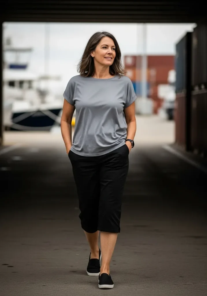 This outfit features a gray tee with a relaxed drape paired with black cropped pants. The shape is simple and practical with slip-on sneakers that match the laid-back vibe. It has a sporty feel without looking too gym-ready.
