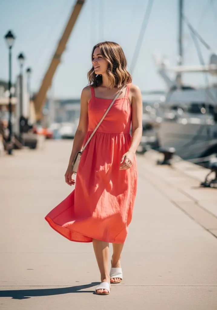 This coral sundress brings a bright, sunny energy with its lightweight fabric and simple straps. The skirt moves easily with every step, and the soft crossbody bag keeps the look hands free. White slide sandals keep everything light and add to the summery feel.