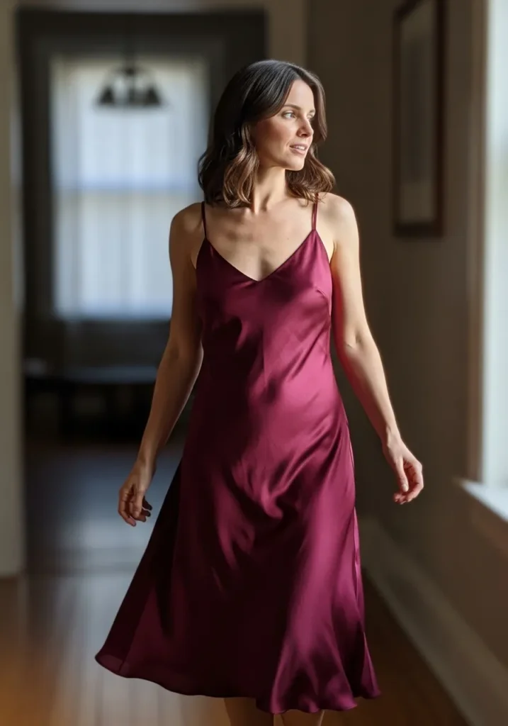 This slip dress comes in a deep berry shade with a smooth satin finish. The thin straps and simple V neckline keep the style minimal while the fabric drapes softly over the body. The length hits a flattering point that feels graceful as it moves.