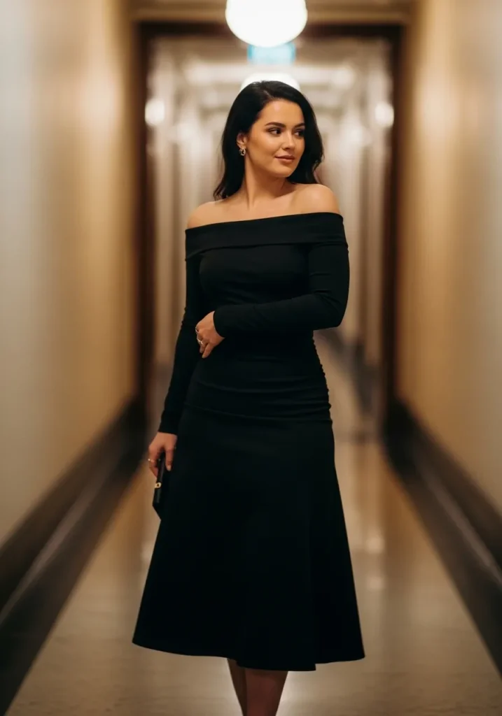 I always feel confident in an off shoulder dress since it highlights the collarbone in such a pretty way. This one feels classic and modern at the same time. It works well when I want a chic look that still feels comfortable for a long evening.