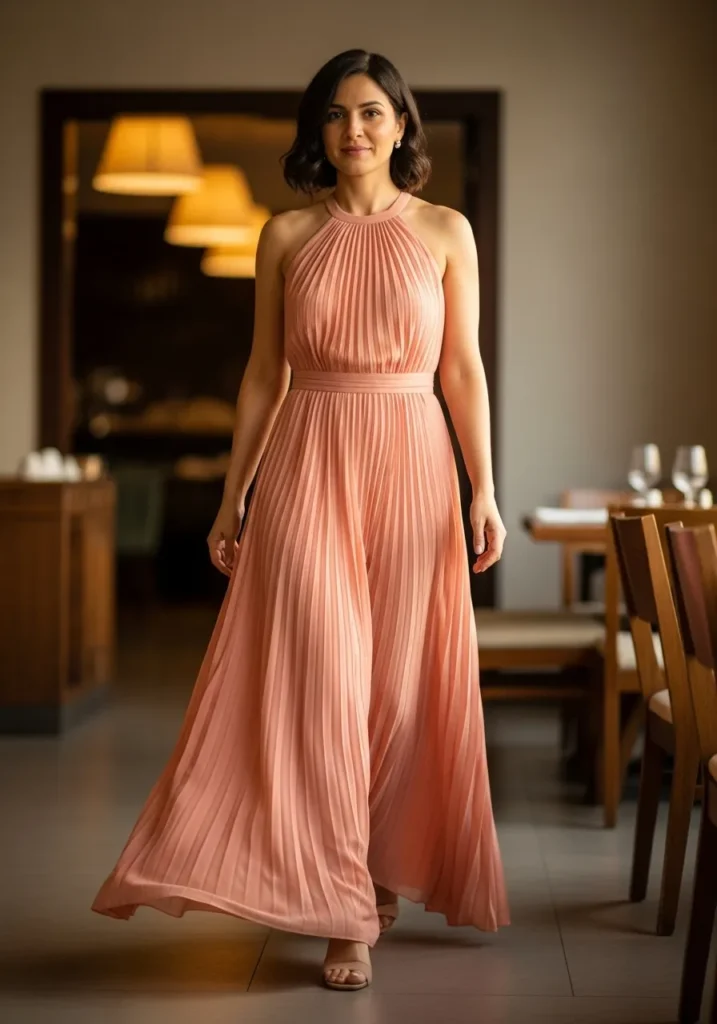 I love gowns that feel dramatic without being stuffy. The sheen makes me feel a little glamorous and the halter design adds confidence. It’s perfect for a night when I want to make dinner feel special.