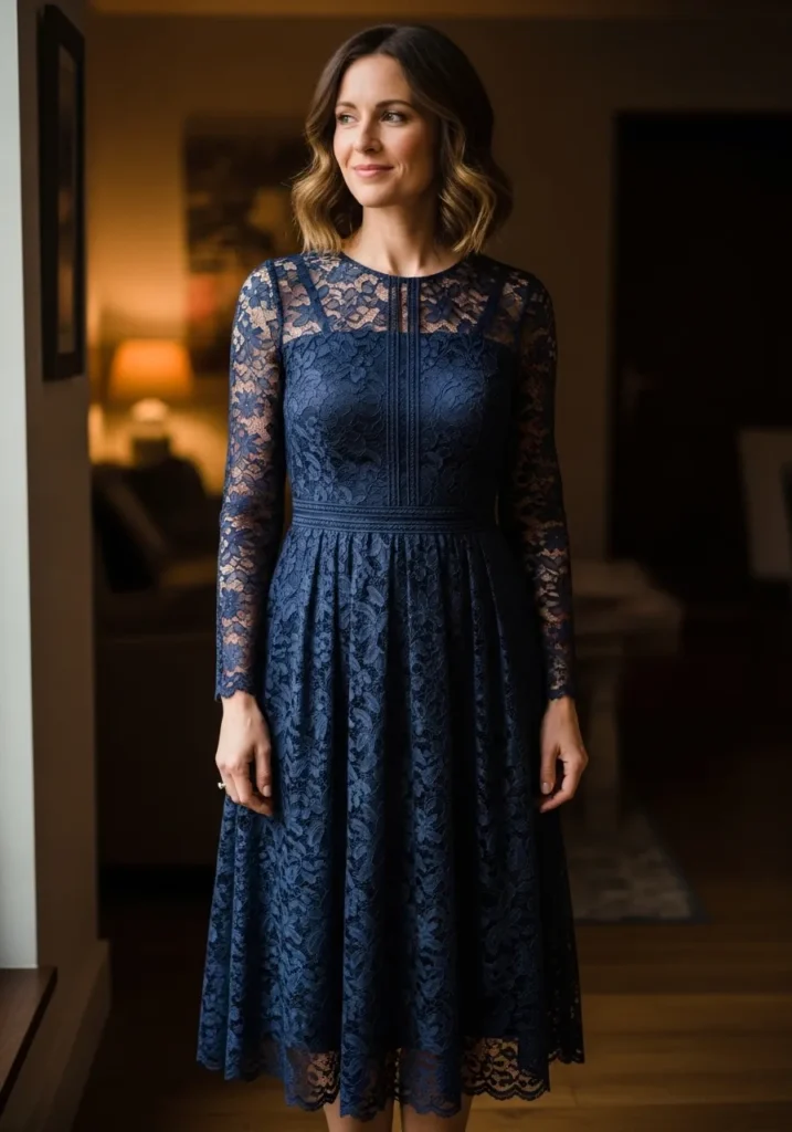 This navy lace dress shows off a timeless look with long sleeves and a delicate floral pattern. The fitted bodice and gently flared skirt work together to create a classic silhouette that feels romantic yet refined. The details are soft and feminine without being too busy.