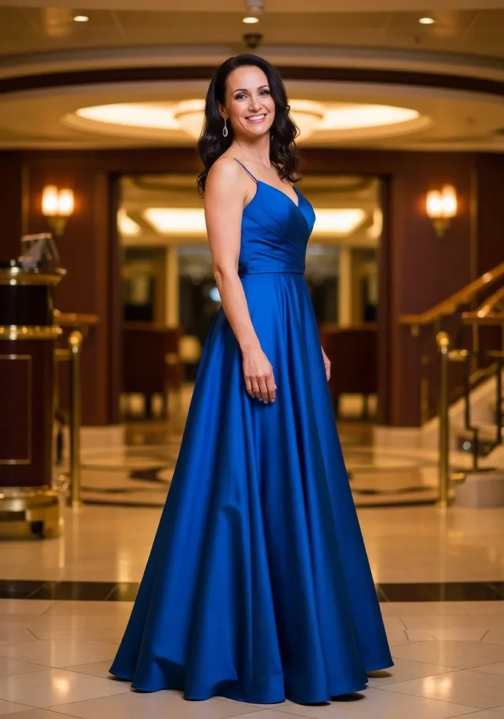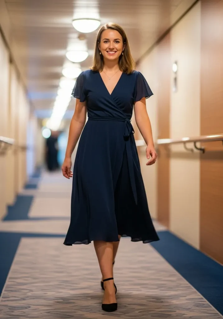 This navy wrap dress has a floaty skirt and light sleeves that add a soft touch. The tie detail shapes the waist while the smooth fabric keeps the whole look breezy. The color brings a classic feel that works perfectly for evenings on the ship.
