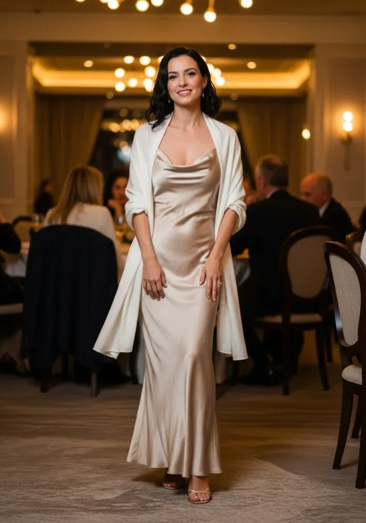 I love how luxurious this outfit feels without being too flashy. The wrap makes it practical for chilly dining rooms and the color gives such a gentle elegance. It’s the kind of look that makes the whole night feel a little more magical.