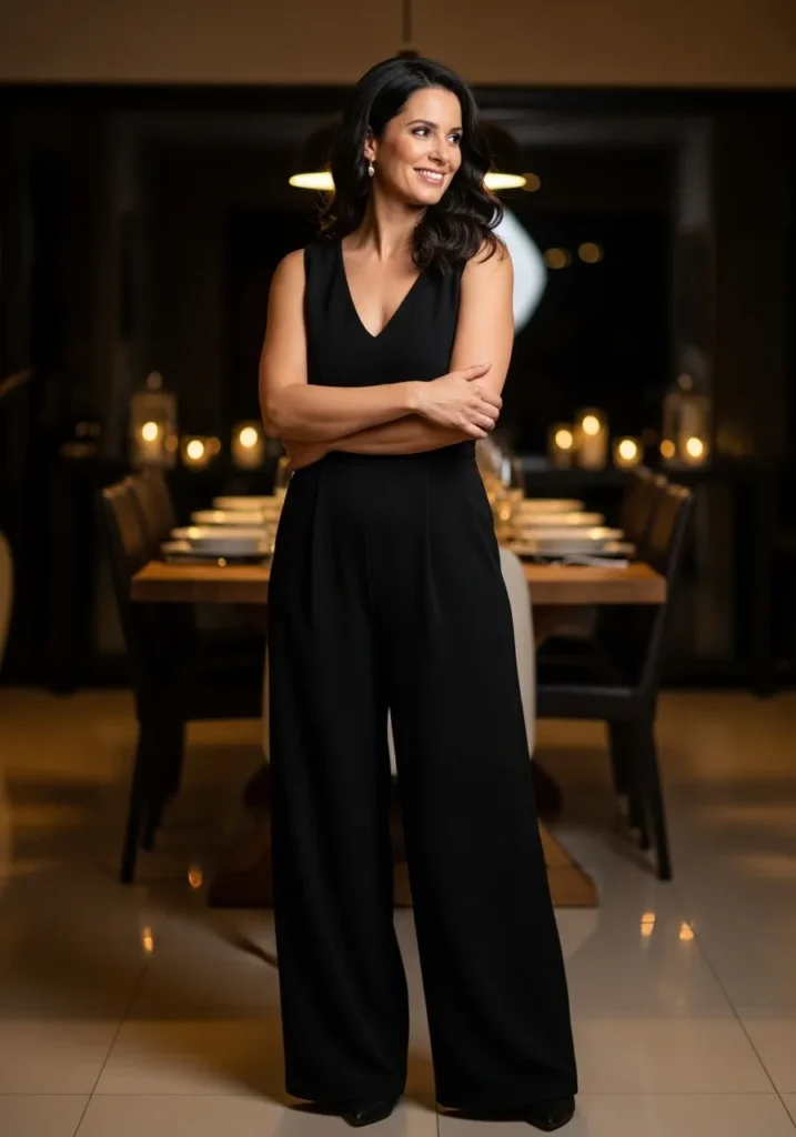 This black jumpsuit brings clean lines with wide legs and a fitted top that creates a modern silhouette. The deep neckline and smooth fabric add a sophisticated feel while still keeping everything comfortable enough for a long dinner.