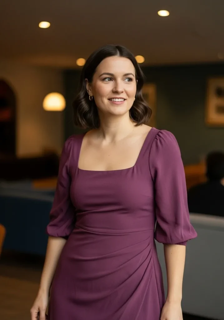 This plum dress offers a square neckline with gentle gathers along the bodice and sleeves. The fabric skims the body in a way that feels soft and flattering. The deeper color adds richness and gives the outfit a refined look.