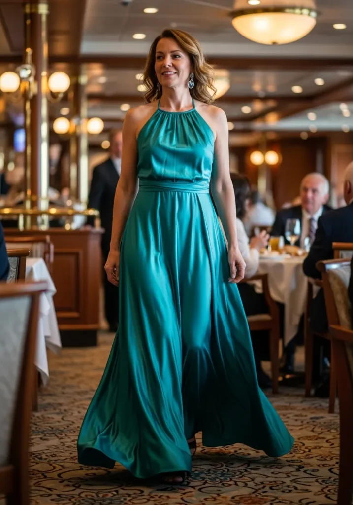 I love how this dress keeps things simple while still giving that special dinner vibe. The shape feels comfortable after a day at sea and the color lifts my mood the moment I slip it on. It strikes that sweet balance between effortless and pretty.