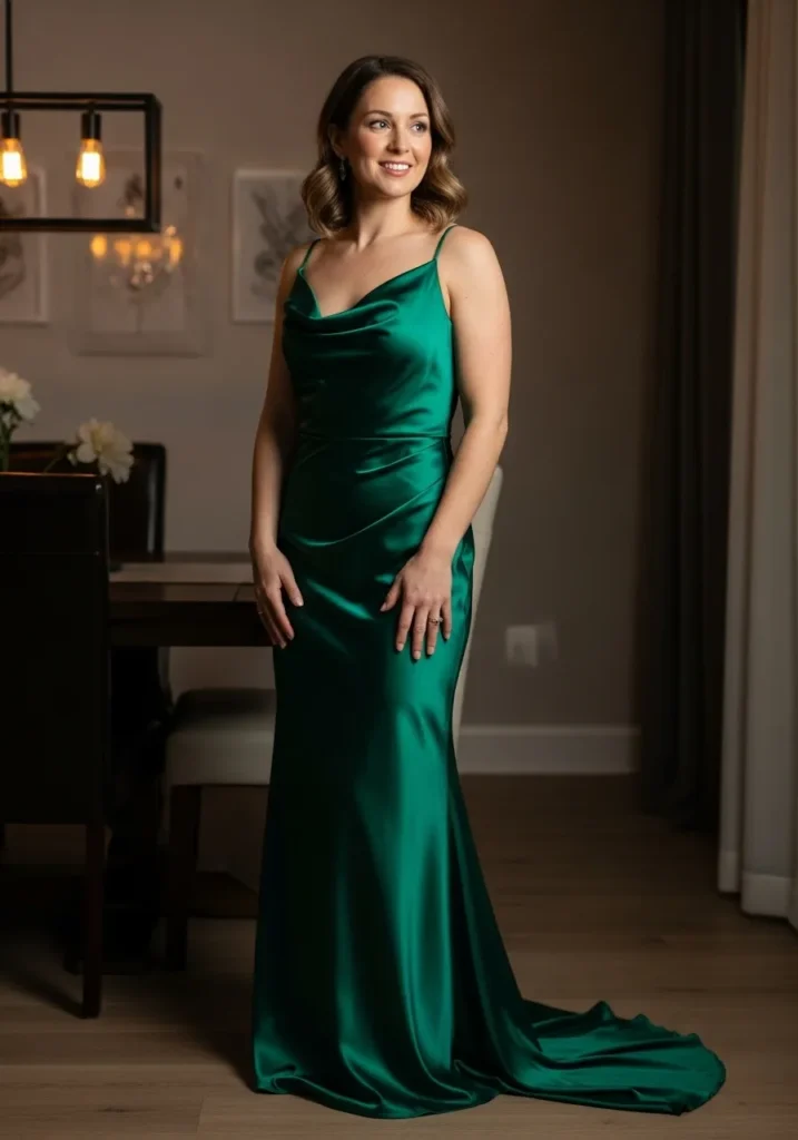 This emerald satin gown creates a smooth silhouette with a soft cowl neckline and slim straps. The fabric has a glossy finish that catches the light in a lovely way. The skirt falls straight with a little sweep at the bottom that adds quiet drama.