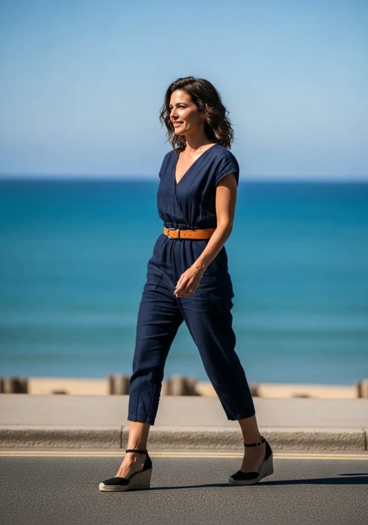 This navy jumpsuit is effortlessly chic, featuring a deep v-neck and a flattering belted waist. The soft fabric drapes beautifully, making it perfect for an afternoon stroll by the beach. Paired with tan espadrilles, this outfit exudes a casual yet stylish vibe, ready for a relaxed day or evening out.