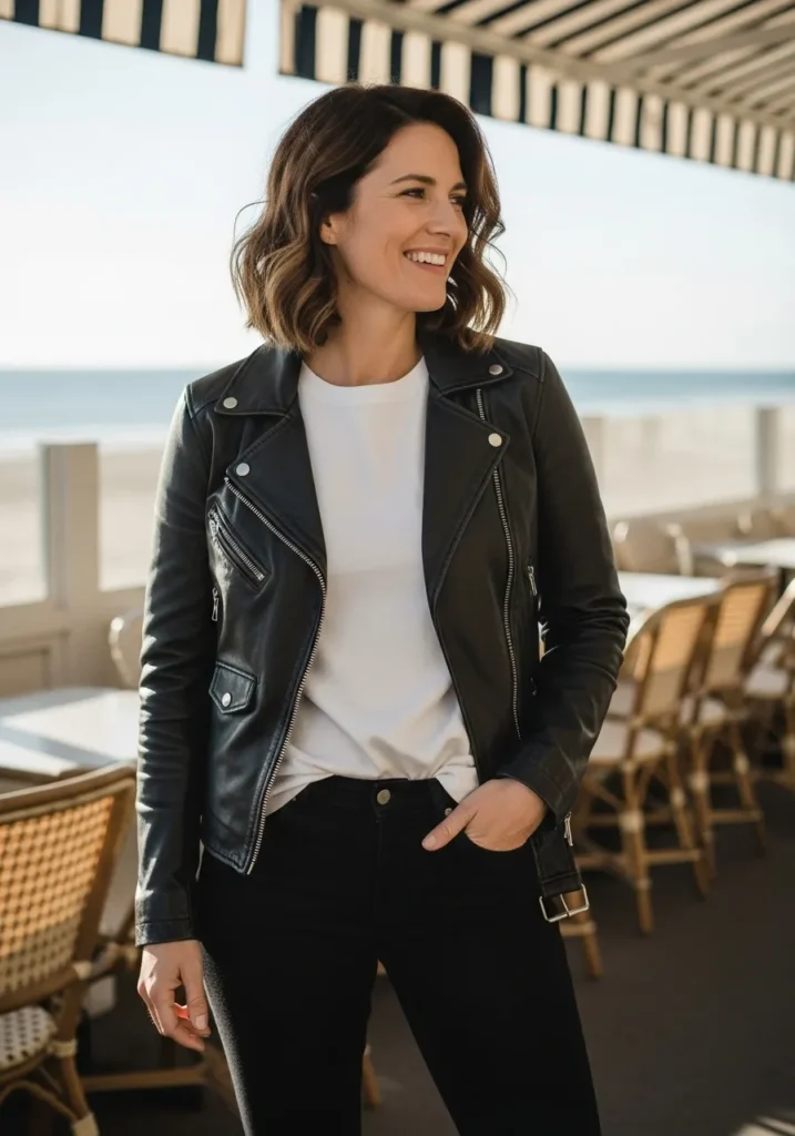 This look gives off major cool-girl vibes with a black leather jacket over a simple white tee. Paired with black skinny jeans and sneakers, this outfit is both laid-back and edgy, perfect for a casual cruise day or a port-side café stop.