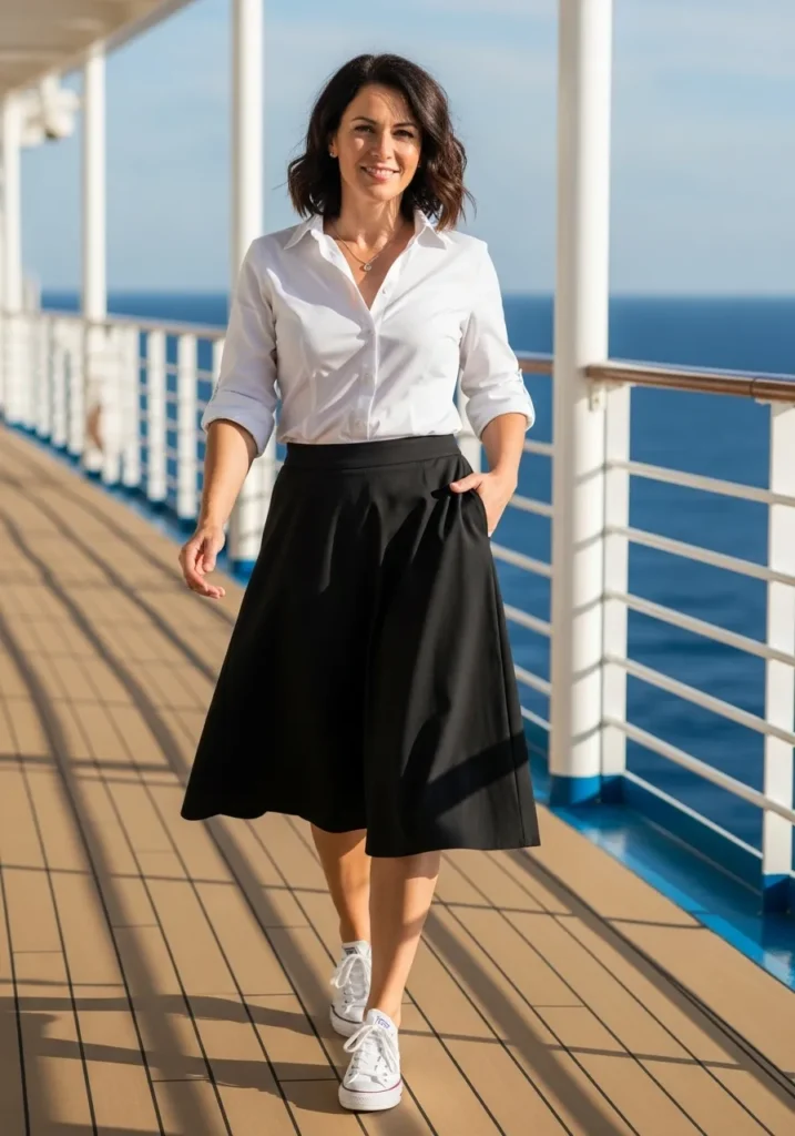 A crisp white button-down shirt tucked into a flowy black skirt creates a sophisticated yet relaxed outfit. Paired with white sneakers, this look feels both polished and easygoing—perfect for a stylish day on the ship or an afternoon in port.