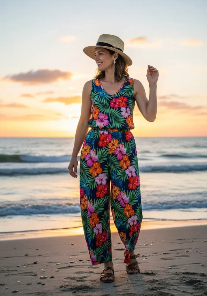 This tropical-inspired floral jumpsuit is everything you need for a beachside stroll. The bright florals on a deep blue background pop beautifully against the sunset sky. Paired with a classic straw hat, this outfit brings a touch of playful sophistication, making it perfect for both day and night.
