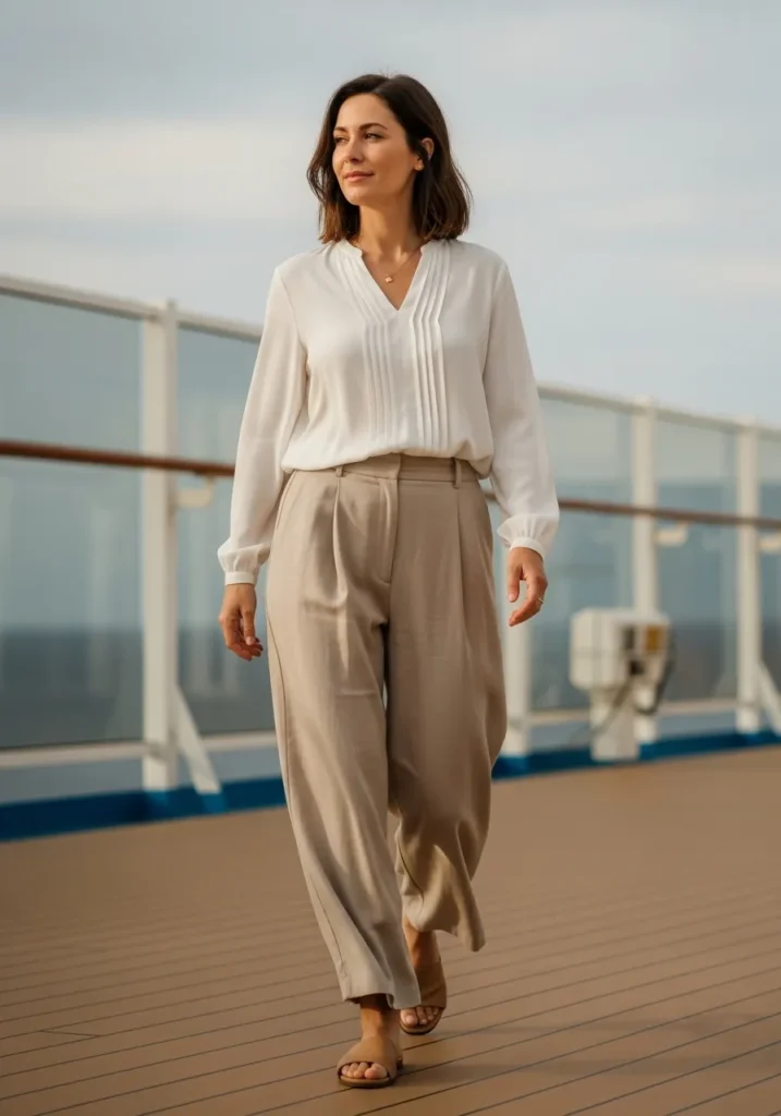 This breezy white blouse paired with wide-legged beige trousers creates a polished yet relaxed look. The light, airy fabric of the blouse and the flowy pants make it the ideal outfit for a sunny cruise day. The neutral tones are balanced with tan sandals, giving it a soft, understated elegance.