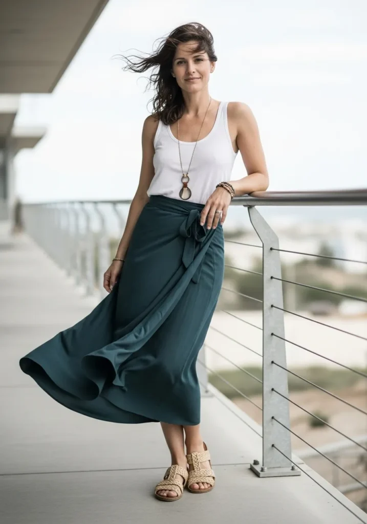 This flowing green skirt paired with a simple white tank top gives off an effortlessly cool vibe. The skirt’s soft, breathable fabric moves with the breeze, while the tank top keeps things light and fresh. Comfortable sandals round out this easygoing vacation look, perfect for a day of sightseeing or shopping.