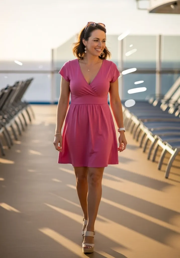 This sweet pink dress is effortlessly flattering with its relaxed fit and deep V-neck. The flowy material drapes beautifully as you walk, while the wedge sandals elevate the look for an evening out. The soft pink color is perfect for those sunset moments on the cruise deck.