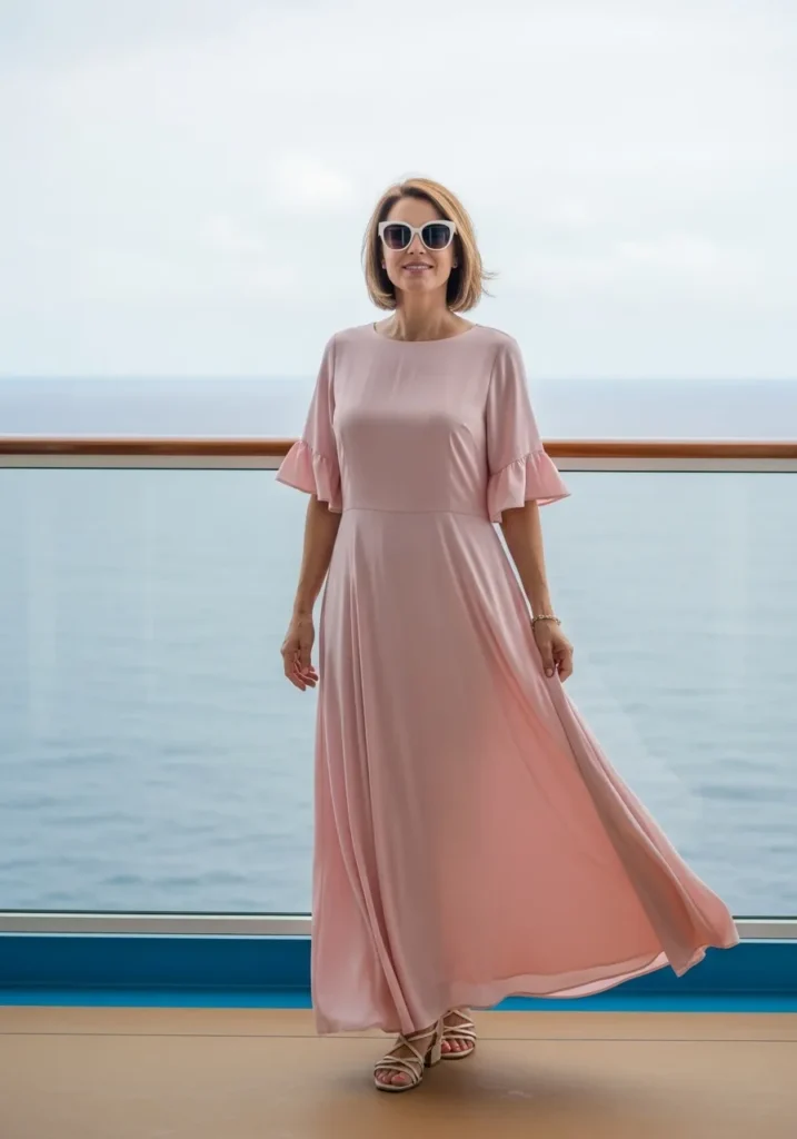 I can’t get enough of how this dress combines comfort with class! The flowy silhouette makes it feel light and airy, and the soft pink is just stunning against the blue of the ocean. It’s such a flattering look that works for a variety of cruise activities.