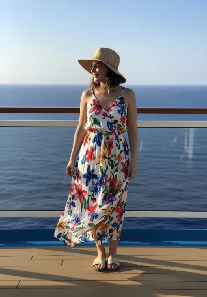 This vibrant floral maxi dress is perfect for those sunny days on deck. The colorful flowers pop against the soft, flowing fabric, and the dress’s loose fit keeps you comfortable while looking stylish. Paired with a wide-brimmed sun hat, this outfit exudes vacation chic.