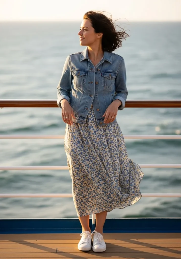 I’m all about mixing casual and chic, and this combo nails it! The denim jacket keeps the look grounded, while the floral skirt adds just the right amount of femininity. It’s perfect for those cooler evenings on the ship when you still want to look cute!