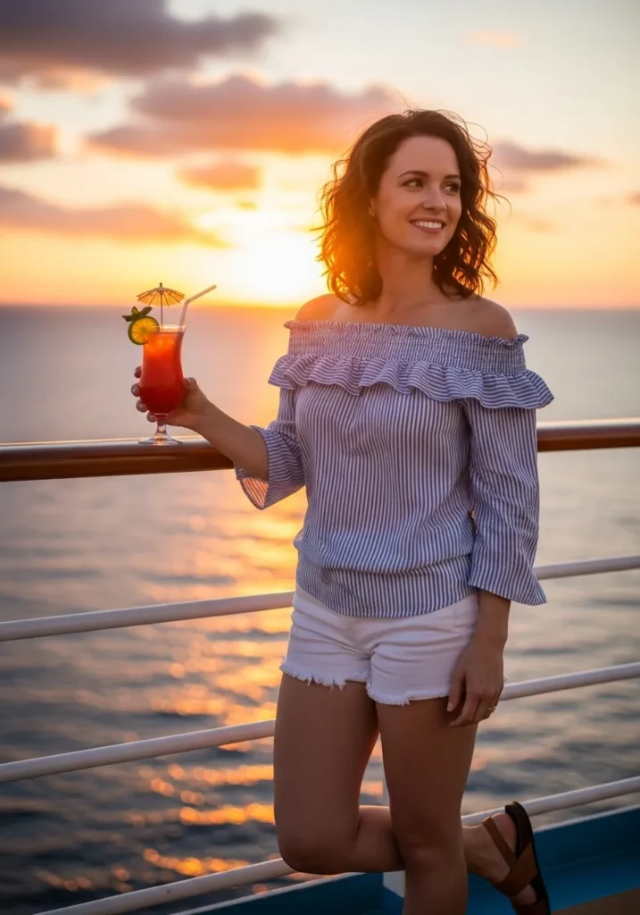 This off-shoulder striped top with ruffles adds a touch of flair to your casual cruise look. Paired with white denim shorts, this outfit is both breezy and chic, perfect for an evening drink or a stroll along the promenade. The off-shoulder detail gives it a playful yet elegant vibe, and the sunset backdrop only adds to the charm.