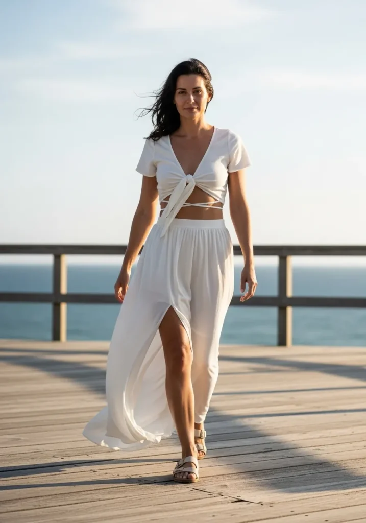 This chic white outfit features a tie-front crop top paired with a flowing maxi skirt. The soft white fabric and the slit in the skirt make it a breezy yet stylish choice for a sunny day at sea. The simple sandals add a touch of casual elegance, making this an effortlessly beautiful vacation outfit.