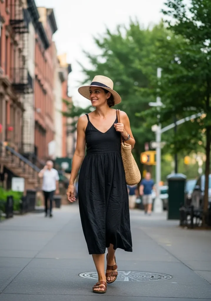 This outfit features a simple yet stylish black sundress paired with brown sandals and a woven straw bag. The dress has a relaxed fit, with a V-neckline and spaghetti straps that keep the look breezy and effortless. Completing the ensemble is a wide-brimmed straw hat, perfect for sun protection on a hot cruise day.