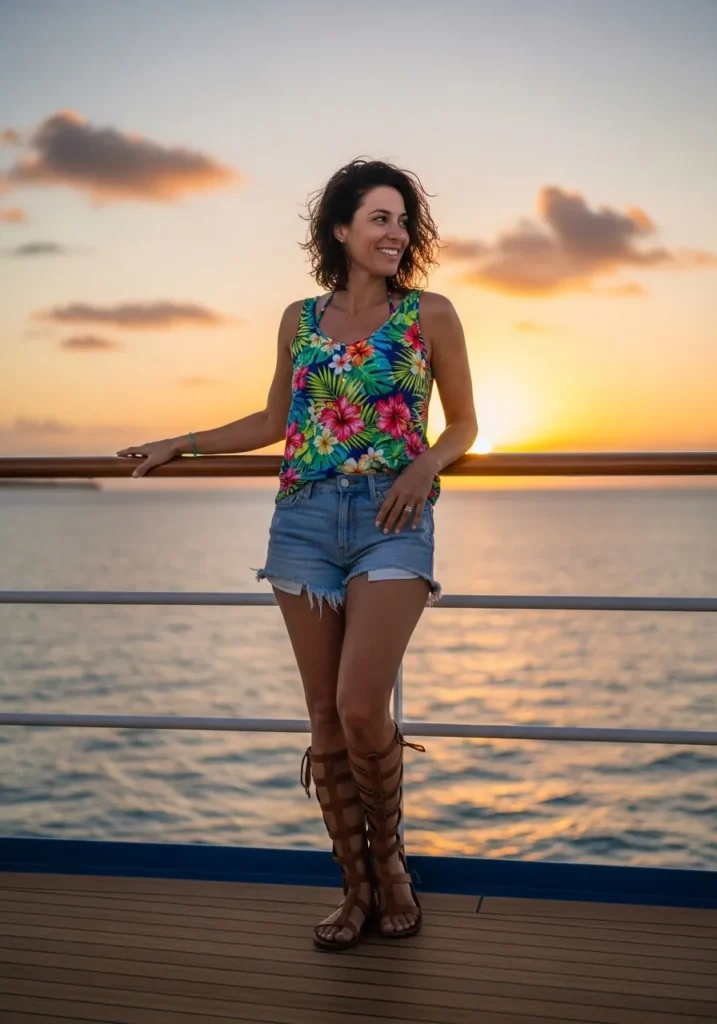 This is the ultimate go-to outfit for a relaxed day on deck or an evening at port. The bright, tropical colors make it playful, while the simplicity of the shorts and sandals keeps it cool and comfortable. It’s the kind of outfit that makes you feel like you’re living your best cruise life.