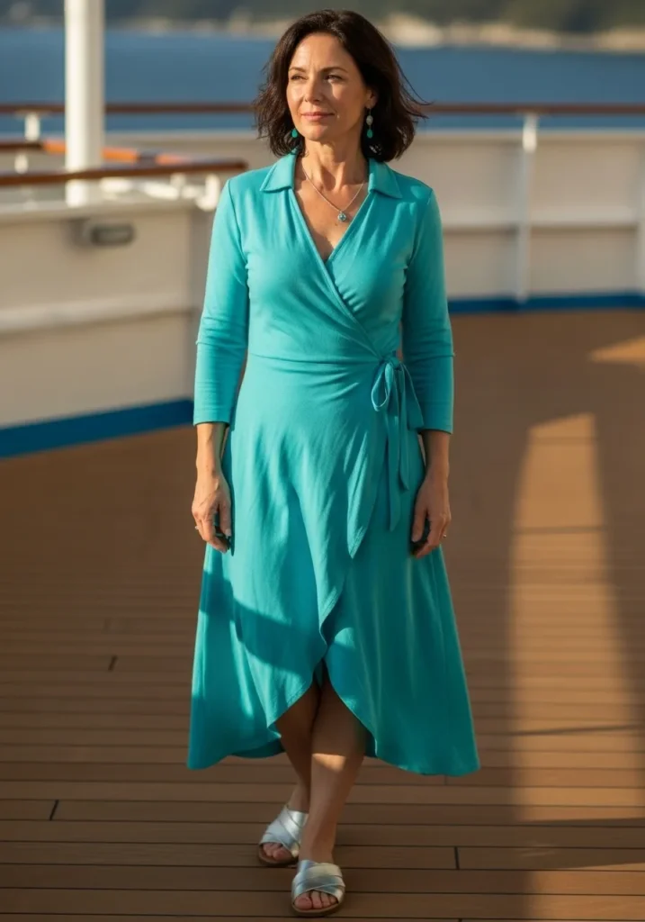 This turquoise wrap dress is ideal for a romantic evening on board. The soft fabric flows gracefully as the gentle sea breeze catches it, and the tie-waist creates a flattering silhouette. Paired with metallic sandals, the outfit feels fresh and elegant while still relaxed enough for a casual cruise evening.