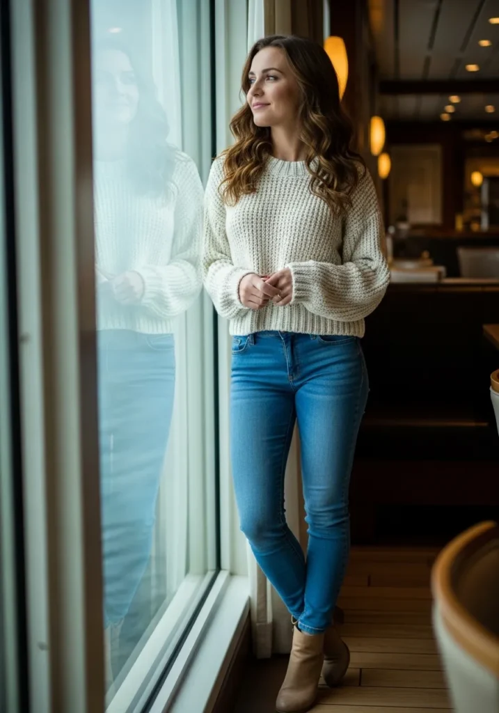 For those cooler evenings, a knitted cream sweater paired with denim jeans provides the perfect cozy, stylish look. The soft sweater pairs effortlessly with the jeans, and the light brown boots add a touch of warmth and style, making this outfit perfect for a relaxed dinner or a casual stroll on the ship.