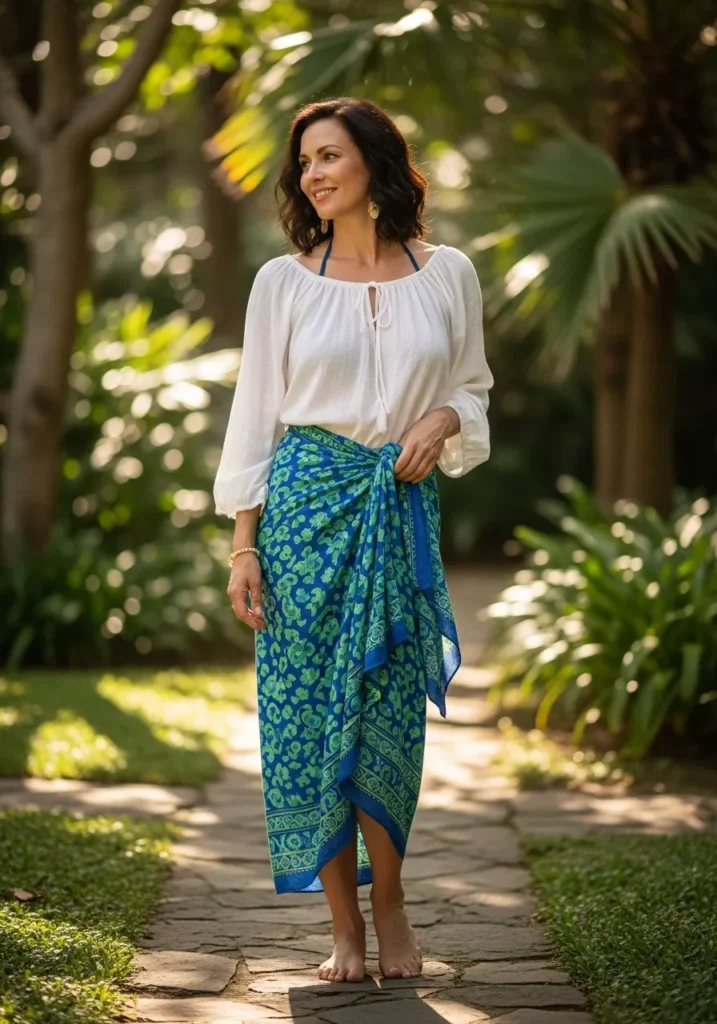 A light, off-the-shoulder blouse and a beautiful blue sarong skirt make for a gorgeous tropical cruise outfit. The flowing top with delicate billowy sleeves adds a touch of elegance, while the bold blue and green floral print on the sarong brings a vibrant, vacation-ready energy. Paired with simple barefoot sandals, this outfit exudes tropical charm.