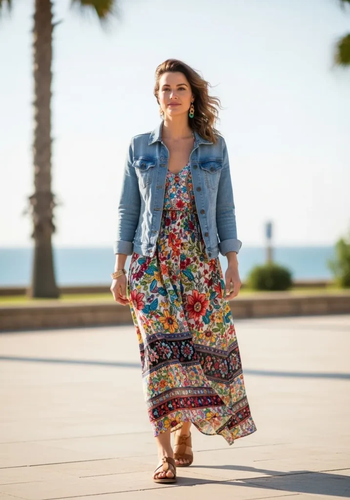 Embrace a colorful floral print maxi dress for your next cruise outing. Paired with a classic denim jacket and tan sandals, this look strikes the perfect balance between laid-back and stylish. The dress is flowy and breathable, with a deep neckline that makes it a great pick for warm-weather excursions. The denim jacket offers a layer of comfort when the sun sets and the breeze picks up.