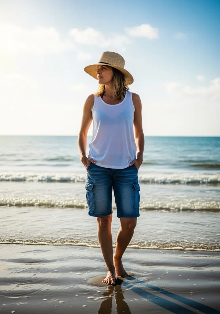 For a laid-back day by the beach, this outfit combines a simple white tank top with casual denim cargo shorts. The look is completed with a wide-brimmed straw hat for sun protection and relaxed style. The soft sunlight and clear sky make it the perfect outfit for a relaxed beach stroll.