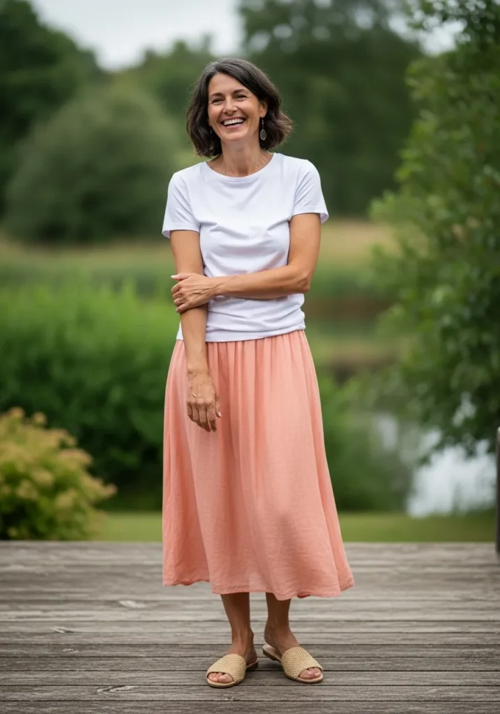 Her outfit mixes a simple white tee with a soft peach midi skirt that moves gently with every step. The skirt adds a sweet feminine touch while woven slides keep things casual. The colors feel light and airy which matches the easygoing mood.