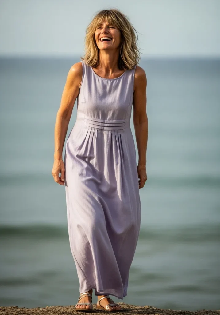 This look centers around a soft lavender sleeveless maxi dress that moves beautifully in the warm breeze. The fabric has a gentle drape that keeps the silhouette long and smooth. The pleated detailing at the waist adds shape without feeling tight. Simple metallic sandals finish the outfit with a light shimmer that fits perfectly with the ocean in the background. The whole look feels calm, feminine and relaxed.