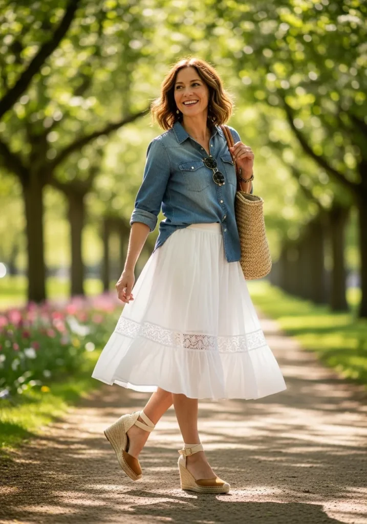 This outfit pairs a chambray button up top with a full white midi skirt that features lace panel details. The skirt brings softness and movement while the denim adds a relaxed contrast. Espadrille wedges lift the look and a woven tote adds a summery touch.