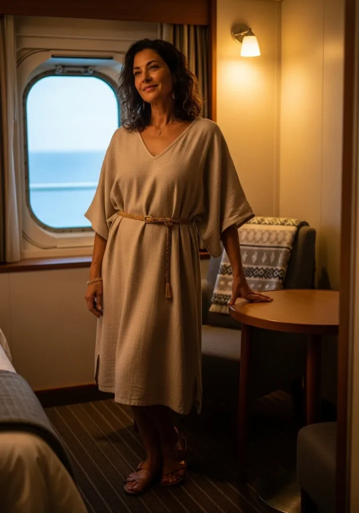 I enjoy how this dress shapes the waist without feeling tight. The softness of the fabric makes it ideal for slow mornings or early evenings on board. I would reach for something like this when I want to feel comfortable yet still put together. It has the kind of ease that makes cruise days flow smoothly.