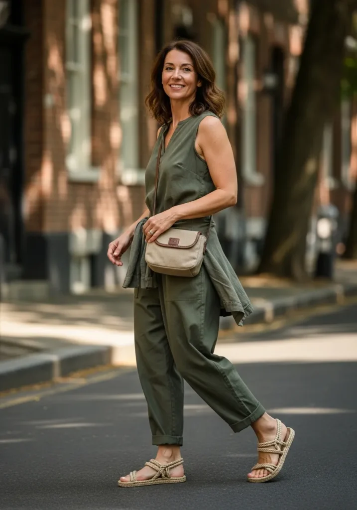 Her outfit features an olive sleeveless utility style jumpsuit with a relaxed fit. A matching jacket tied around the waist adds shape and brings a casual touch. Rope sandals and a natural toned crossbody bag keep everything earthy and simple. The outfit feels practical and stylish at the same time.