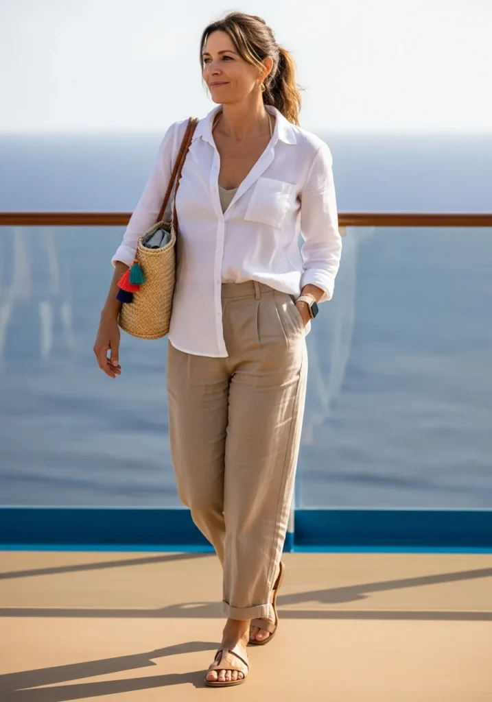 I appreciate how linen always brings such an effortless vibe. The mix of light layers makes this perfect for mild cruise weather. I would wear this on casual days when comfort matters but I still want to feel neat and put together.