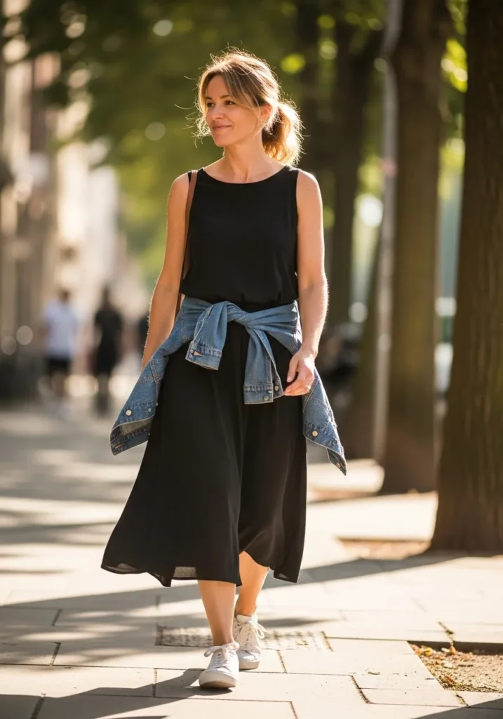 Her outfit starts with a black sleeveless midi dress that swings gently as she walks. A classic denim jacket tied at the waist adds shape and brings a casual touch to the look. White sneakers keep everything relaxed and practical for long walks. The outfit feels simple and sporty with just the right amount of everyday charm.