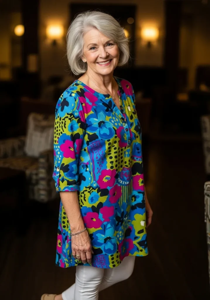 A bold floral tunic brings color and fun with its mix of blues pinks and greens. The loose shape pairs well with slim white pants that balance the volume. Soft loafers keep the look relaxed and perfect for evenings indoors.