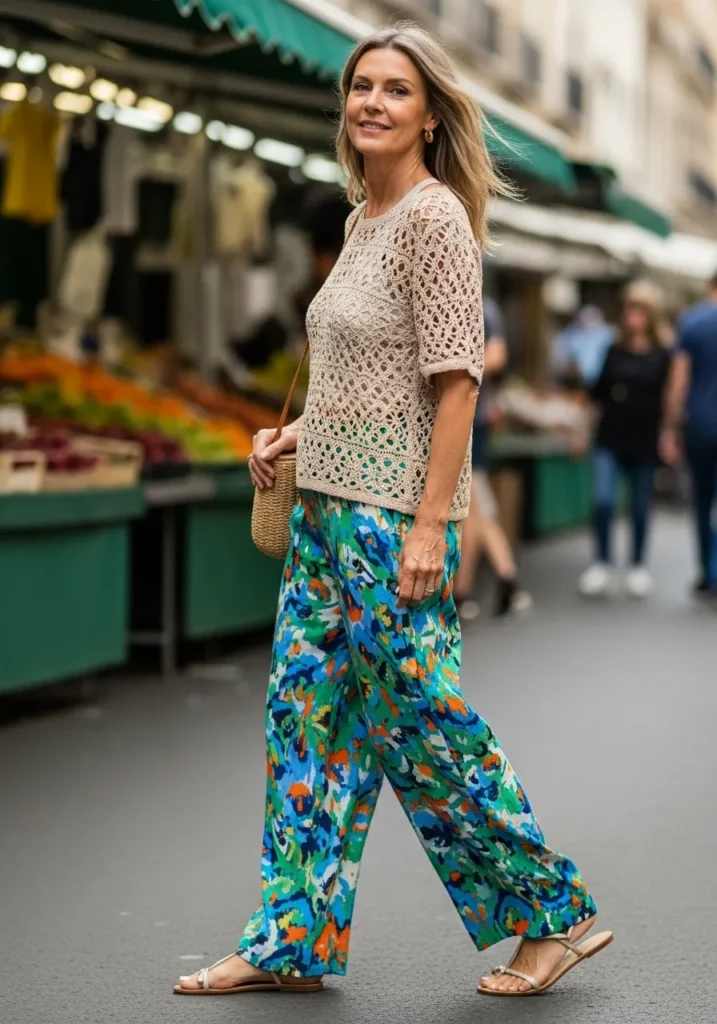 A beige crochet top adds texture and pairs beautifully with loose printed trousers in greens blues and orange. The look feels creative and relaxed especially with simple sandals and a woven bag.