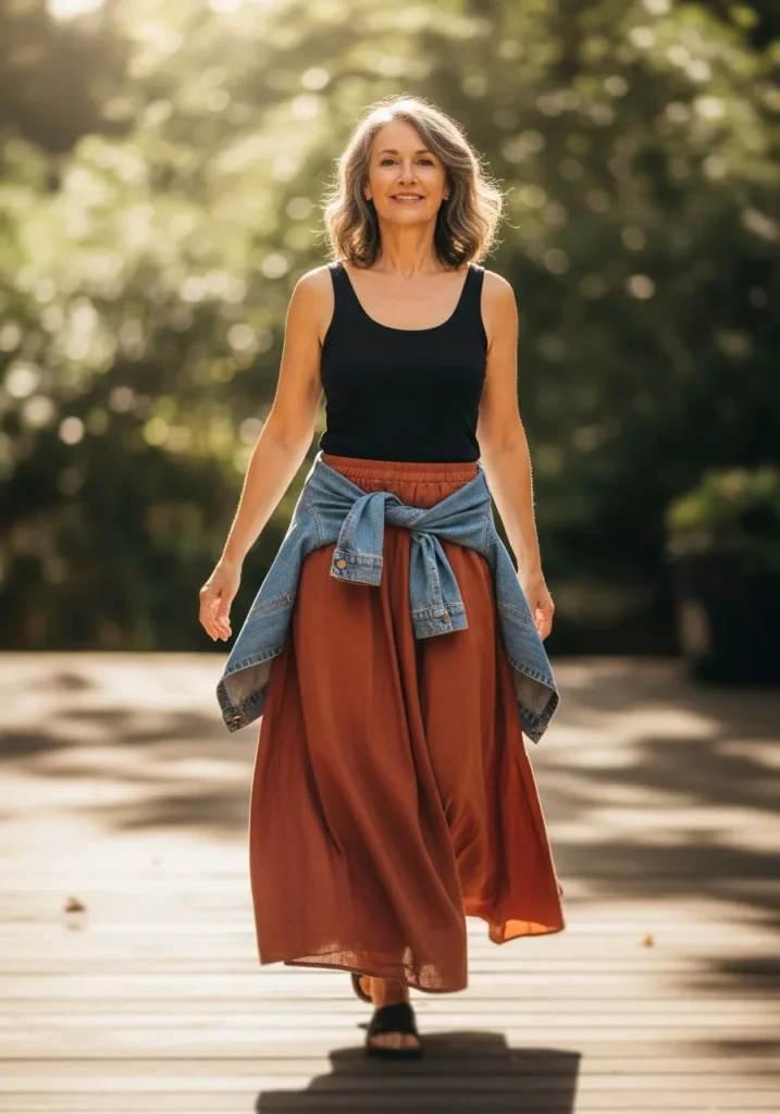 A black tank sits neatly above a flowing rust colored maxi skirt. A denim jacket tied at the waist adds a casual touch and helps break up the look. Simple sandals keep the outfit easy and walkable.