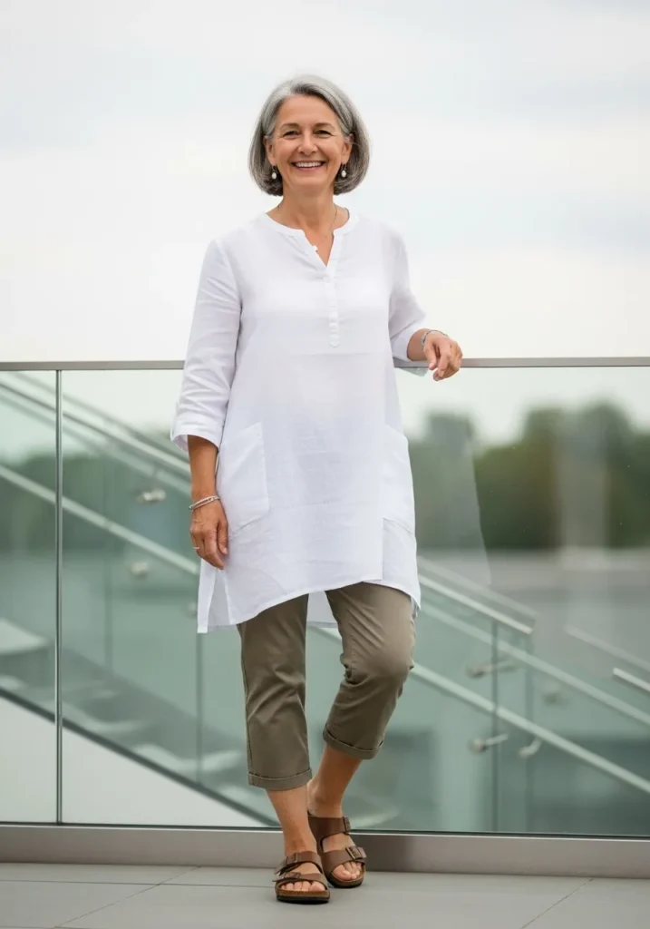 A white linen tunic stays light and breezy and pairs well with soft olive cropped pants. The outfit feels clean and simple with brown strap sandals adding comfort for walking.