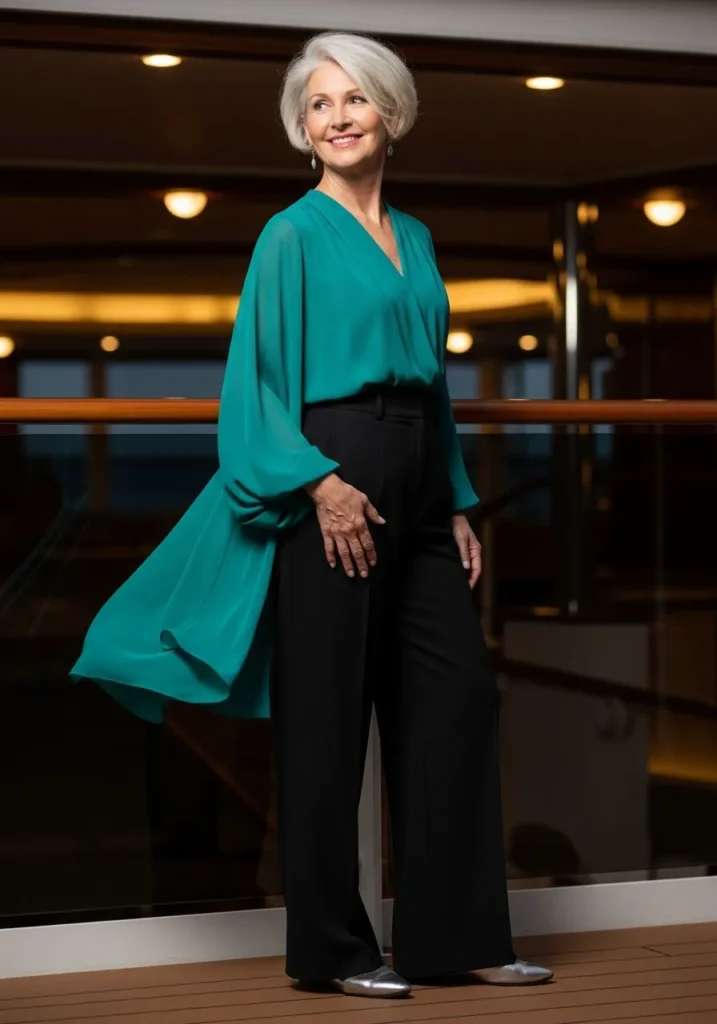 A flowing teal blouse brings a soft shimmer with its airy sleeves and longer draped back. It pairs beautifully with sleek black trousers that give the outfit shape without losing comfort. Silver flats add a little shine that feels perfect for evenings on the ship.